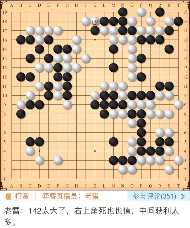 141再次弈出问题手,被142断开中间,上边还要打劫,黑棋局势一落千丈。