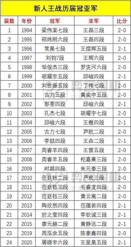 半决赛中等级分最高的屠晓宇和王星昊各自击败陈豪鑫四段和王春晖初段,晋级本届决赛。这是历届新人王首次,连续两届是相同棋手争冠。