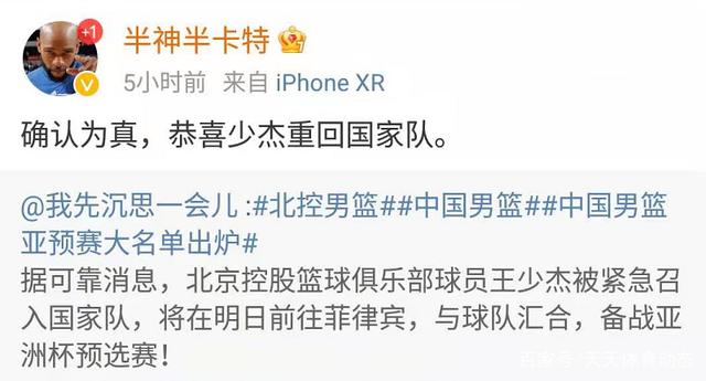 在中国男篮出发前往菲律宾之后,最终的14人大名单依旧是不少球迷热议的话题。对于中国男篮来说,此次集结真的是遇到了很多的困难,其中球员的伤病问题非常严重,国家队几大主力先后离队。而就在出发之前,周琦又被诊断出了左眼视网膜裂孔,基本上也不会参加此次亚预赛和落选赛了。此次最后的14人大名单,内线球员本来就比较少,只有周琦、沈梓捷和刘传兴三人,在周琦基本上无法参赛之后,中国男篮的内线问题就非常严重了。网上有消息称,为了补强国家队的内线,“王少杰被紧急召入国家队,将在明日前往菲律宾,与球队汇合,备战亚洲杯预选赛!”随后知名媒体人“半神半卡特”确定了这个消息是真的。这也将是王少杰首次正式代表国家队比赛。