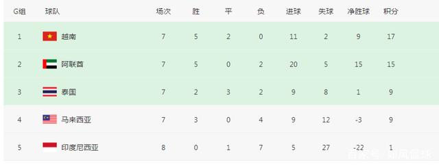 在本届世预赛,阿联酋被分在G组,同组的其他球队为越南、泰国、马来西亚、印度尼西亚。7场比赛,阿联酋交出了5胜2负的战绩,一共拿到15分,在这个小组里,阿联酋的表现仅次于领头羊越南。数据显示,阿联酋已经轰进了20球,这样的火力冠绝G组,甚至比越南还要强。可惜的是,阿联酋首回合与越南交锋,以0-1的比分告负,失去了争夺小组第一的主动权,形势变得严峻。