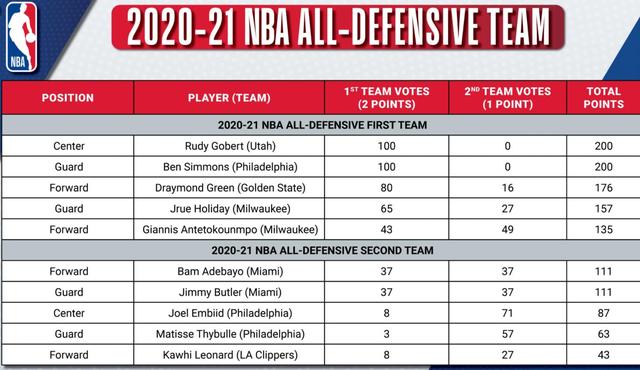 第一阵容里,戈贝尔获得100张第一选票,0张第二选票,积200分;本西蒙斯获得100张第一选票,0张第二选票,积200分;追梦格林获得80张第一选票,16张第二选票,积176分;霍乐迪获得65张选票,27张第二选票,积157分;字母哥获得43张第一选票,49张第二选票,积135分。