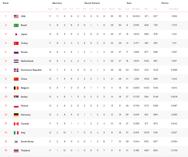 由于荷兰队本轮输球,美国队本轮的比赛还未打就确定提前晋级。美国队取得11连胜,领先第五、六名的俄罗斯与荷兰皆是3个胜场,俄罗斯与荷兰队皆还剩3场比赛,理论上胜场能够追平。美国队拥有33分,荷兰队与俄罗斯队目前同积23分,可见美国队拥有10分优势,仅剩三场比赛的俄罗斯与荷兰积分已经不够,无法达不到美国队的成绩。因此,美国队提前锁定前四名,率先晋级四强。