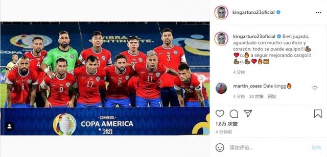 直播吧6月15日讯 今天早晨,智利在美洲杯中1-1战平阿根廷,赛后比达尔在Instagram上发文鼓励了球队。