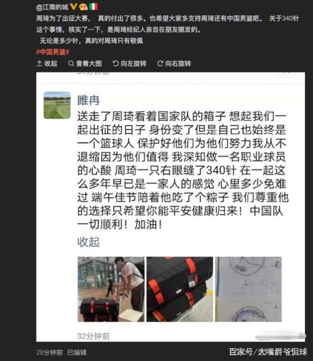 周琦的好友兼经纪人睢冉也在个人朋友圈上大赞周琦为国奉献,“我深知做一名职业球员的心酸 周琦一只右眼缝了340针 在一起这么多年早已是一家人的感觉心里多少免难过 端午佳节陪着他吃了个粽子 我们尊重他的选择。”