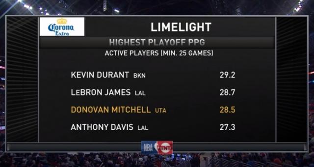 比赛过程中,转播方给出了现役球员中季后赛场均得分的前四名(至少打过25场比赛):