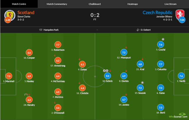 在whoscored的赛后评分中,此役发挥出色打入2球的捷克中锋希克拿到全场最高的9分。苏格兰方面,打满全场的利物浦球星罗伯逊获得7.7分,仅次于拿到9分的希克,排在全场第2位。这也足以证明,罗伯逊本场比赛的发挥确实非常出色。