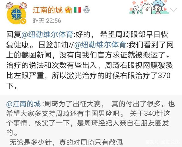 博主江南的城转发了睢冉的朋友圈,并且表示无论是多少针,对周琦只有敬佩。不过周琦的经纪公司表示治疗的说法和次数有出入,周琦右眼的伤情比左眼更严重,所以激光治疗的时候治疗了370下。不论是340针还是370下,对于周琦的手术之后火速驰援中国男篮的做法表示敬佩,对于中国男篮来说,就需要有血性的硬汉。