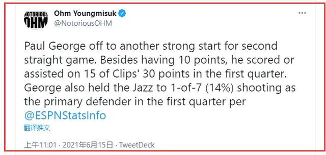 “保罗乔治连续2场比赛开局表现强劲,他一人通过得分和助攻贡献了首节快船全队30分钟的15分,同时,首节爵士队球员在面对乔治防守时,7投只有1中,命中率不到14%”