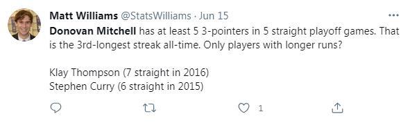 第二项纪录是米切尔已经连续5场比赛至少命中5个三分球,目前正在追赶2015年的库里与2016年的克莱-汤普森