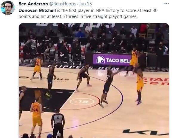 第三项纪录是:米切尔成为NBA历史上第一个连续5场比赛都拿下30+并且至少命中5个三分球的球员。