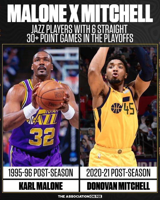 第三节开场米切尔就突破篮下制造犯规拿分,随后又助攻英格尔斯三分命中,又在三人包夹击地分球给戈贝尔暴扣,随后又命中三分球将得分破了30+,三节30分钟,18中8,三分12中5,罚球10中9,拿下30分4篮板4助攻1抢断。他连续6场季后赛得分上30+追平了爵士名宿卡尔-马龙,米切尔又再创造纪录了。