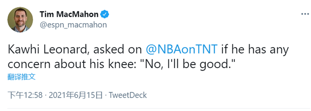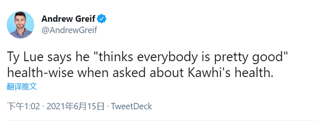 赛后接受采访时,莱昂纳德谈论是否对自己的膝盖有担忧时表示:不,我会好的。而从他走回球员通道来看,并没有什么问题。赛后,主帅泰伦卢在接受采访时也表示,他认为所有人的健康状况都非常好。看起来,这次受伤并没有太大问题。