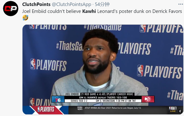 此役,莱昂纳德轰下了31分7板3助2抢断,并且贡献了季后赛以来最激动人心的一记隔扣。这记隔扣多疯狂?爵士一众球员全部看得目瞪口呆,场边的球迷也感到难以置信。另外一个直观的反应就是,在费城球员恩比德接受采访时,他看到了这一幕,恩比德直接说了一句OH MY GOD,然后问身边的人说你看到小卡这个暴扣了吗?随后,恩比德再度感叹:太强了!
