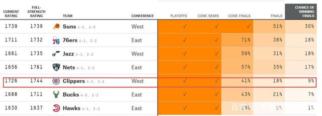 赢下此战后,快船晋级概率回升到41%,杀进总决赛概率为18%,总冠军赔率9%排名第五。