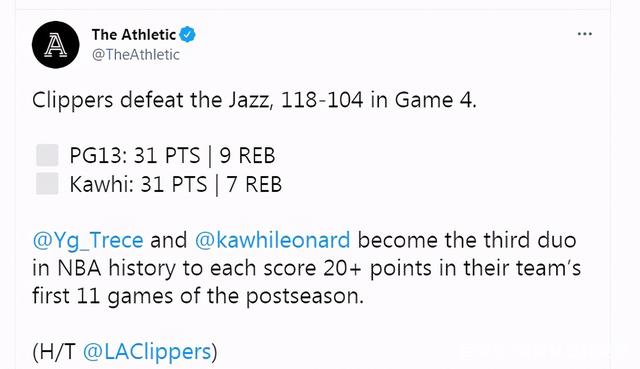 这场比赛,小卡和乔治都在季后赛连续11场打出20+,追平了格里芬和麦卡杜,并列快船队史第一。他们两人也成为NBA季后赛历史上第三对连续11场砍下20+的组合。