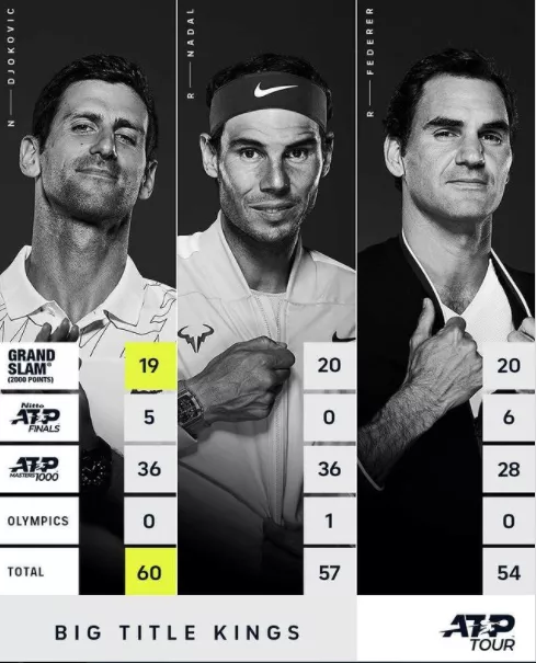 6.在重大冠军(大满贯+年终总决赛+奥运会+大师赛)排行榜上位列榜首,德约科维奇共获得60个重大冠军,纳达尔以57个、费德勒以54个分列第二和第三。