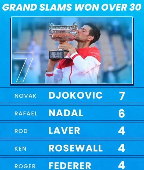 法网夺冠后,德约科维奇刷新了如下几个重要纪录: