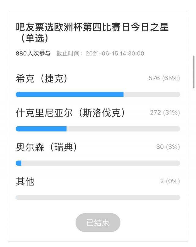 一共880名吧友投票,希克得票率65.45%。昨晚希克的那粒普斯卡什级别的超远吊射真的把大家惊到了!