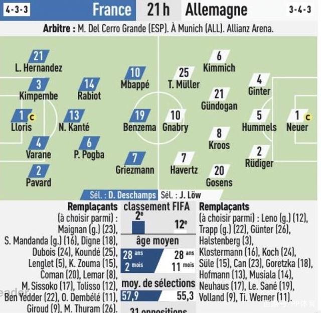 北京时间明天凌晨3:00,欧洲杯小组赛F组首轮的一场焦点战将在法国同德国之间进行。赛前《队报》给出了本场比赛的首发预测。
