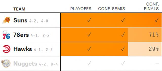篮网与雄鹿队、快船与爵士队的天王山之战,那都存在着一些变数,欧文与哈登是否会回来?乔治与小卡是否还能爆发?这2点就带来了极大的悬念,76人队与老鹰队的情况就不同了,西蒙斯与恩比德整体上是比较稳定的球星,他们很难再像G4一般出现下半场的低迷,或许也正因为如此,在《fivethirtyeight》的最新预测中,76人队是有着高达71%的晋级决赛概率,所以本文这6支球队里,76人队在天王山之战赢球的把握应该是最大的吧?