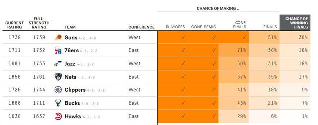 目前爵士队晋级西决的概率为59%,快船晋级西决的概率为41%,爵士晋级总决赛的概率是31%,快船晋级总决赛的概率只有18%,这就足以说明两虎相争必有一伤,太阳坐山观虎斗收渔翁之利,太阳晋级总决赛的概率为51%,夺冠概率30%都是目前联盟第一!