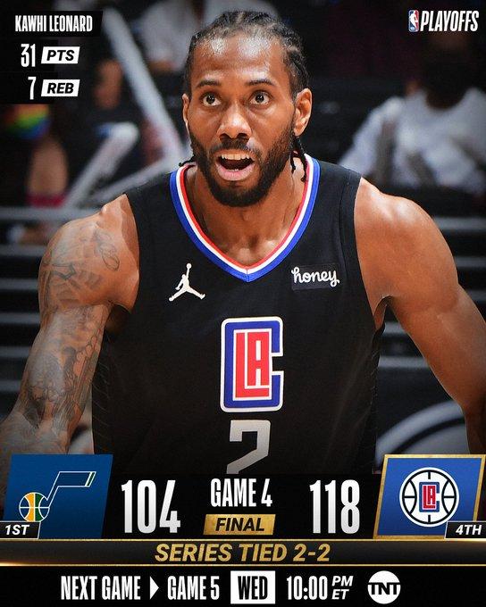 科怀-莱昂纳德还贡献了超级隔扣,他隔扣了中锋德里克-费沃斯,除此之外他还封盖了博扬-博格丹诺维奇,全场比赛34分钟,19中9,三分7中3,罚球13中10拿下31分7篮板3助攻2抢断1盖帽攻防一体,这支快船看上去又有了0-2落后翻盘的可能性,首轮他们就是这样完成了翻盘。