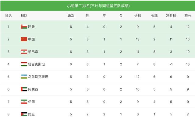 另外一场比赛,塔吉克斯坦4-0轻取缅甸队,由此F组比赛的排名都敲定了,塔吉克斯坦拿到13分位居第2名,在8个小组第2名的积分榜里,拿到了10个有效积分(跟小组垫底的缅甸是1胜1负的成绩),-1个净胜球,暂时排名第4名。