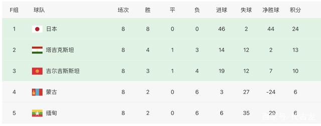 北京时间6月15日晚上,40强赛F组结束了最后一轮比赛的对决,日本队5-1大胜吉尔吉斯斯坦,塔吉克斯坦4-0大胜缅甸队,由此F组的小组排名敲定,日本队8连胜第一,塔吉克斯坦13分位居第2名,吉尔吉斯斯坦第3,蒙古第4,缅甸队第5名。