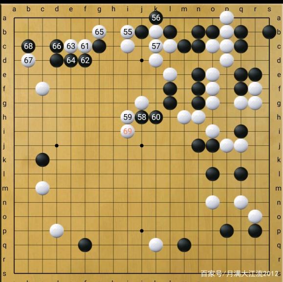 58靠出头,同时压迫右上白棋,白59扳,黑60退。69位挺头是双方的必争点,但如果白棋马上挺头,黑棋就会断上去,上面白棋会很凶险。黄龙士行棋非常稳健,白61先靠入黑角,在上面留下活棋手段后,再69挺头!行棋滴水不漏。
