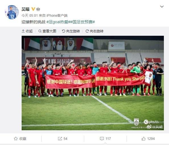 赛后,吴曦也更新了微博,配上了全队拿着“感谢中国球迷!感谢阿国华侨,感谢沙迦”的横幅,并写道:“迎接新的挑战。”