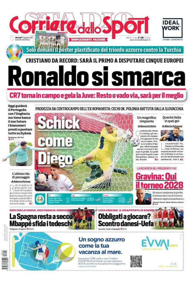 1.“C罗摆脱防守。”克里斯蒂亚诺创纪录:他将成为第一个参加5届欧洲杯的球员。CR7回到球场并警告尤文:我无论留下还是走人,都将是最好的选择。今天C罗将指挥葡萄牙对阵匈牙利,但他在尤文的未来被讨论,斑马军团准备全力依靠迪巴拉。