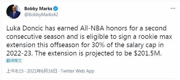 ESPN名记鲍比·马克斯进行了解读。东契奇连续两个赛季入选最佳阵容,使得他可以在这个赛季提前续约顶薪,合同起薪为2022-23赛季工资帽的30%,合同预计为(5年)2.015亿美元。