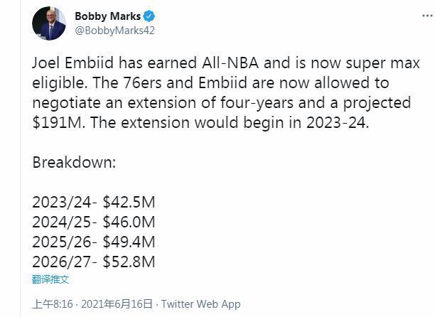 东契奇无疑是今年最佳阵容里的受益者之一。恩比德同样可以获得肥约,他有资格提前续约超级顶薪合同,预计为4年1.91亿美元。新合同从2023-24赛季开始,预计2023-24赛季4250万美元,2024-25赛季4600万美元,2025-26赛季4940万美元,2026-27赛季5280万美元。