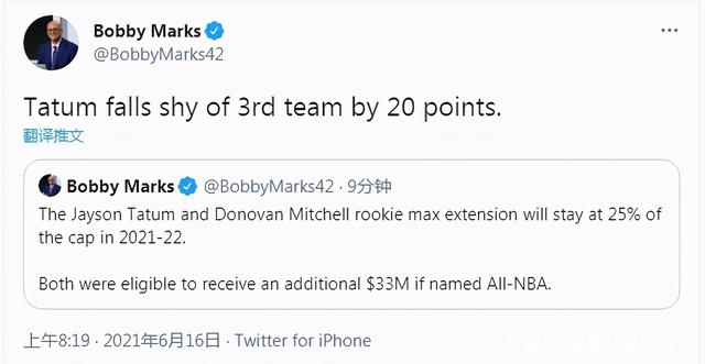 很遗憾,塔图姆和米切尔因为落选最佳阵容,损失了大约3300万美元。鲍比·马克斯还指出,塔图姆就差20分进入第三阵容,真是扎心!
