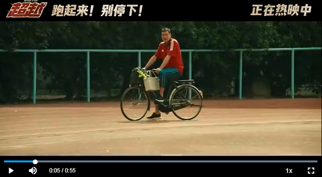 这部电影叫做《超越》,应该是一部关于体育运动和奋斗精神的励志电影。范志毅在电影中骑着自行车,车头挂着菜篮子,明显是从菜市场买菜骑车回来。范志毅在电影中被一群体育学生叫住了,学生让老范用足球表演一个凌空抽射,然后让一个短跑高手去追逐这个足球。