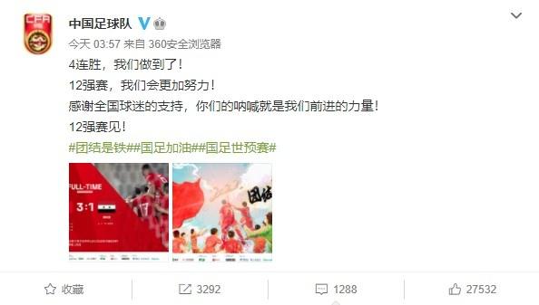 在国足官微发的感谢球迷,12强赛会更加努力的该条微博下点赞数已经超过27000,评论数也超过1200条,转发次数超过3200次。