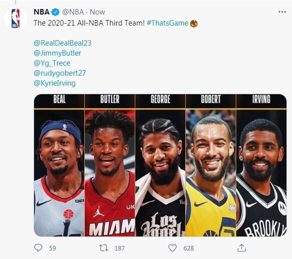 最佳三阵:凯里-欧文、布拉德利-比尔、吉米-巴特勒、保罗-乔治、鲁迪戈贝尔
