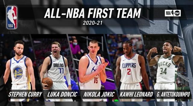 最佳一阵:斯蒂芬-库里、卢卡-东契奇、扬尼斯-阿德托昆博、科怀-莱昂纳德、尼古拉-约基奇