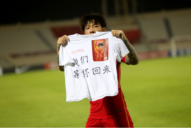 ▲张稀哲举起T恤,祝福受伤队友明天。图/新华社