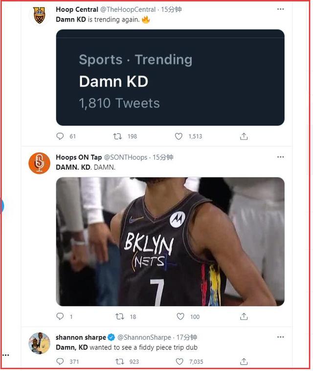 而显然,媒体和球迷们已经被杜兰特的表演震撼了,找不到更好的言辞来形容他的表现,所以直接爆粗,用了一个D字开头的字母,来形容杜兰特的全场的史诗级表演。而“D开头+KD”的话题,也瞬间冲上全美热搜榜第一!
