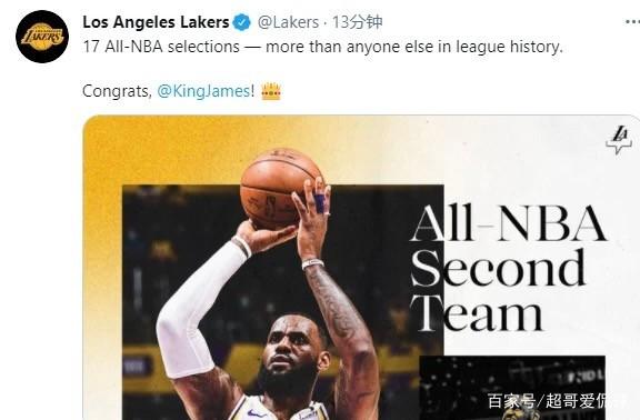 詹姆斯的获奖也让湖人官方迅速发布动态祝贺,官方写道:“祝贺詹姆斯,17次最佳阵容,比联盟历史上任何人都多。”