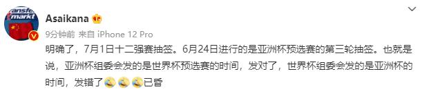 朱艺在微博上写道:“明确了,7月1日十二强赛抽签。6月24日进行的是亚洲杯预选赛的第三轮抽签。也就是说,亚洲杯组委会发的是世界杯预选赛的时间,发对了,世界杯组委会发的是亚洲杯的时间,发错了,已昏。”