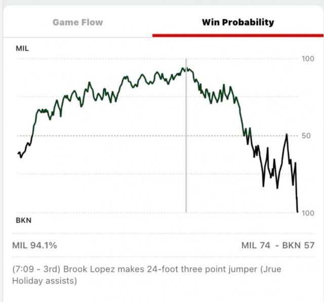 比赛来到第三节,雄鹿在前半节一直保持着两位数的领先优势,数据显示,雄鹿赢球概率高达94.1%,篮网则为5.9%,在这样的情况下,凯文-杜兰特又一次站出来了。单节4投4中拿到11分6篮板5助攻,可以说是既当爹又当妈,带领篮网将分差缩小到6分。末节杜兰特彻底统治了比赛,9投6中,三分5投3中,狂轰20分2篮板2助攻,以及最后时刻的关键抢断,带领篮网114-108成功逆转了雄鹿。