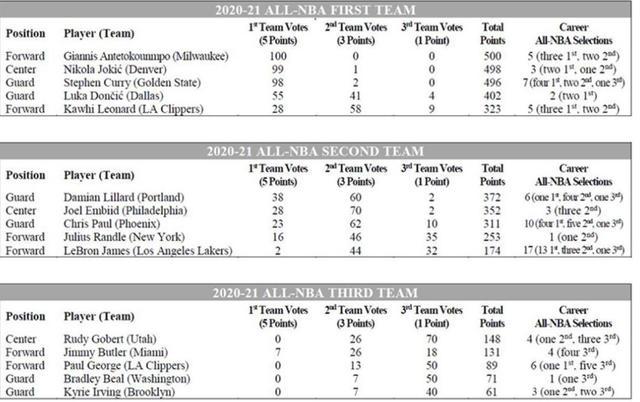 随后NBA公布了最佳阵容的投票情况:字母哥拿到全部的100张第一选票满分500分,约基奇得到99张第一选票力压恩比德(28张),总分拿到498分,斯蒂芬-库里拿到98张第一选票总分496分,东契奇拿到55张第一选票总分402分,莱昂纳德拿到28张第一选票总分323分。