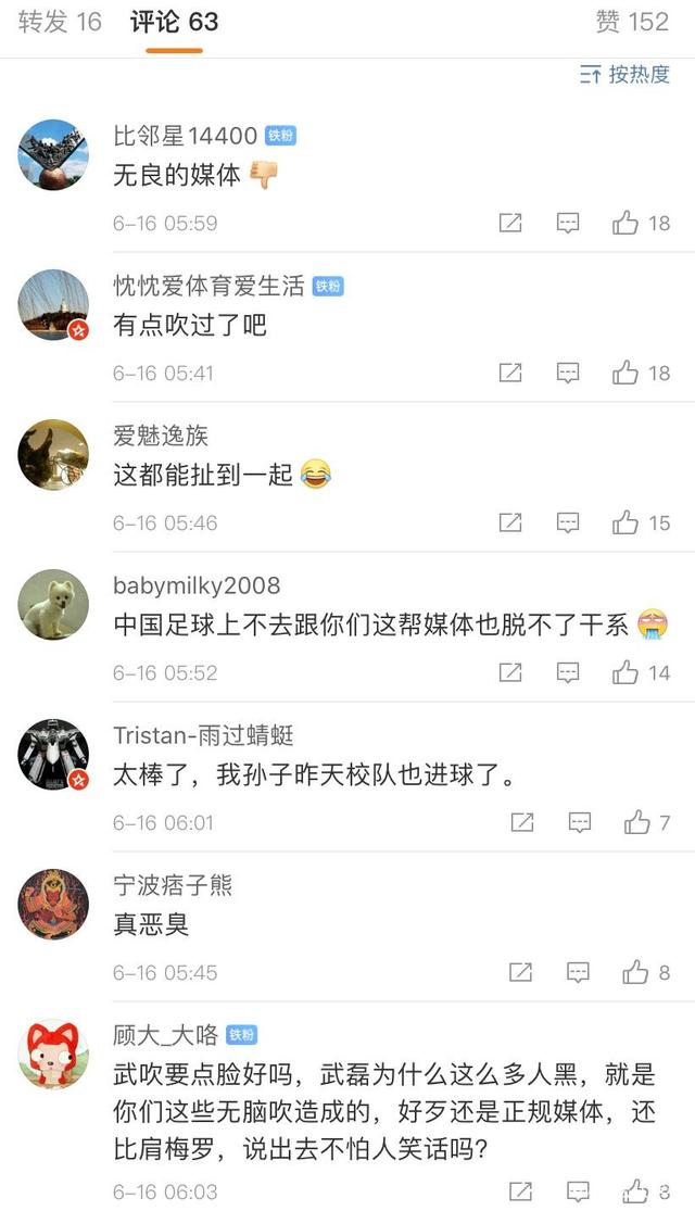 虽然球迷很冷静,但媒体很高调。知名大V“中国足球报道”将武磊比作梅罗,引来大批球迷冷嘲热讽。