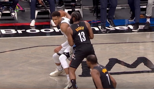 在比赛还剩下1分47秒的时候雄鹿以被篮网以104追平了比分,字母哥这时候面对哈登的防守,然后竟然选择了背打之后的翻身跳投,而不是去冲击篮下。
