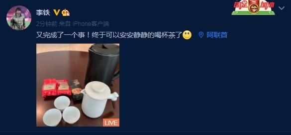 直播吧6月16日讯 率领球队3-1复仇叙利亚进军12强赛后,国足主教练李铁更新个人社交媒体,晒出喝茶照并配文:“又完成了一个事!终于可以安安静静的喝杯茶了。”