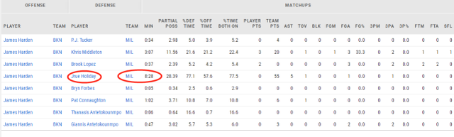 全场比赛,霍乐迪与哈登对位达到了8分28秒。这8分28秒的时间里,篮网得到了55分,哈登送出了5次助攻。同时,霍乐迪本场仅与杜兰特对位24秒。