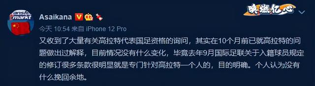 朱艺在研究入籍归化这方面很有权威,这位足球专家再次强调,高拉特至少要在2023年才会获得为国足出场的资格,没有什么挽回余地。