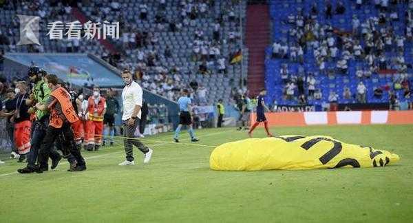 当地时间6月15日,欧洲杯德国队对战法国队的比赛中,突然一名男子乘坐降落伞俯冲进入赛场,过程中还发生了小意外,险些撞到球员和看台。